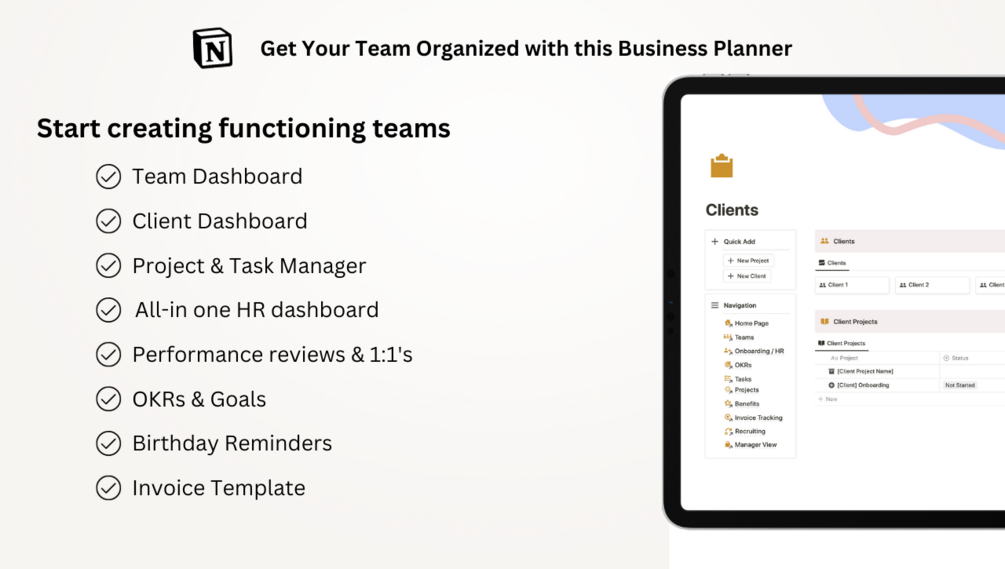 Effortlessly centralize your team's information, streamline HR processes, set and track strategic objectives with precision, and manage tasks, projects, and client interactions seamlessly. With dedicated sections for benefits, invoice tracking, recruiting, and a manager's view, this template ensures every facet of your business is organized and accessible in one centralized space.